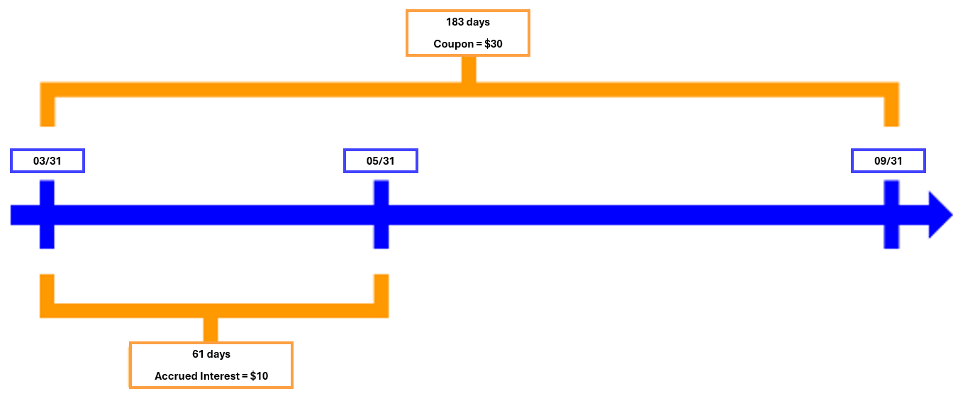 Accrued coupon payments on the secondary market A Treasury bond with a par value of $1,000 at a coupon rate of 6% paid semi-annually. The last coupon payment was made on March 31, and the next payment will be made on September 30, giving a period of 183 days. The coupon payment for each period is $30 ([6%/2] * $1,000). If a trader buys the bond on May 31, the accrued interest will be $10 ($30 * [61/183]) using the day-counting convention: actual number of days in the period / actual number of days in the year. The first bondholder is eligible for the coupon on his holding period (March 31 to May 30), but since he sells the bonds during the period, he will not be paid on September 30. As a result, the bond buyer will pay him the pro rata amount, i.e. $10. Our buyer will receive $30 in coupons on September 30 (i.e. 100% of the coupons), but he was not the owner of the bonds for the entire period, which is why he paid the seller an additional $10 when he bought them. |