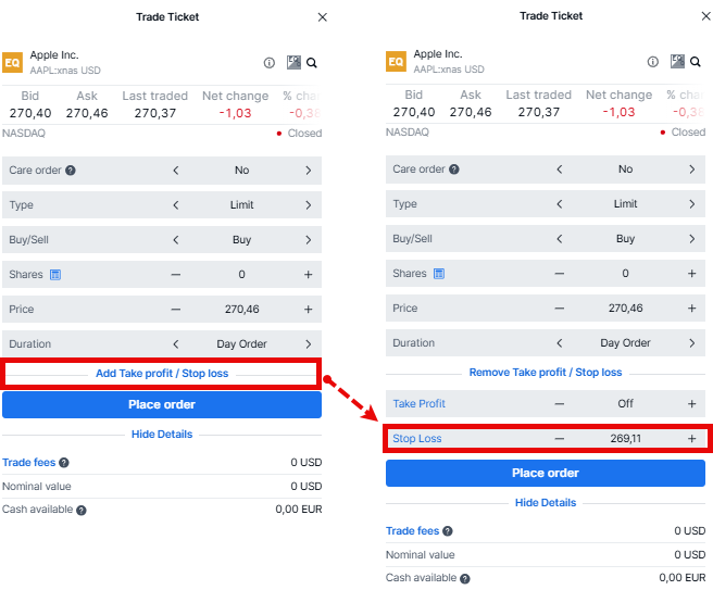 - New positions: To set up a stop-loss on the trade ticket for a new position, click Add Take profit / Stop loss > Select a price by Stop Loss > Click Place order to finalise the trade
