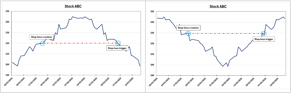 For short (sell) positions: A stop-loss order is placed above the current market price for a short position. If the price of the instrument increases to the stop price, the order is activated and becomes a market order, buying the security at the next available price.