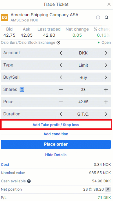 To add a take-profit order to a trade ticket, click Add Take profit / Stop loss > Click Take profit > Choose a Unit (e.g. Price) > Determine your preferred take-profit level at which you want to sell automatically. Take-profit can be added to both new and existing positions.