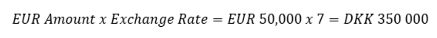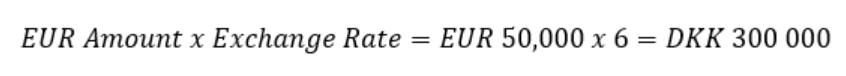 For example, if the EUR/DKK exchange rate changes, it affects the value of EUR 50,000 when converted to DKK. If the rate shifts from EUR 1 = DKK 7 to EUR 1 = DKK 6, the value in DKK will change accordingly. Please note, the difference in value between currencies is calculated between the selected time period.