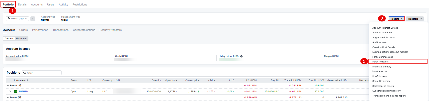 You can view the rollover history on your FX positions by selecting your client from the client tree. Navigate to Portfolio (1), press on Reports (2) and open the Forex Rollovers report (3).