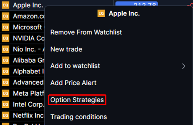 Alternatively, you can right-click on the instrument from the search bar, watchlist, screener, positions module, or orders module and select Option Strategies.