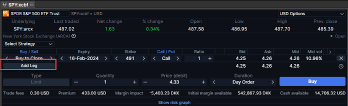 3. It will call the trade options strategy trade ticket with the selected leg in it. Add the new leg by clicking on Add Leg.