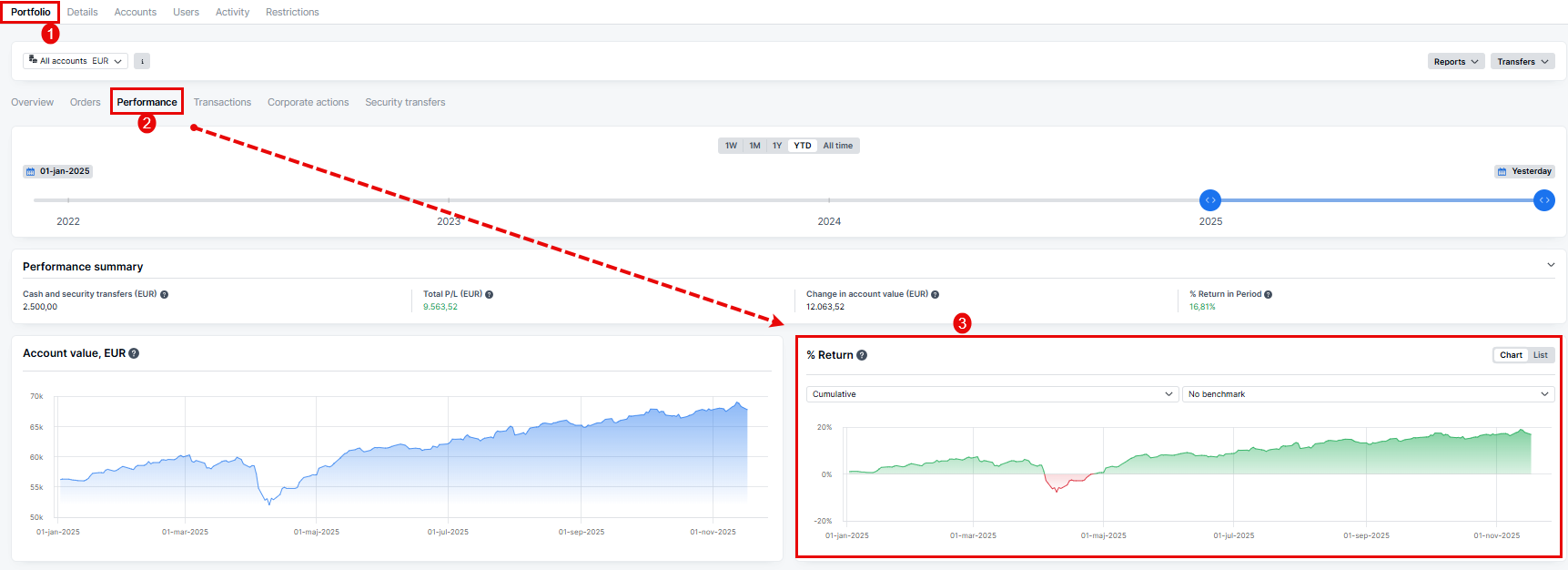 The Cumulative P/L can be found by navigating to your specific client, select Portfolio followed by Performance. The cumulative P/L will be graphically shown like the example below:
