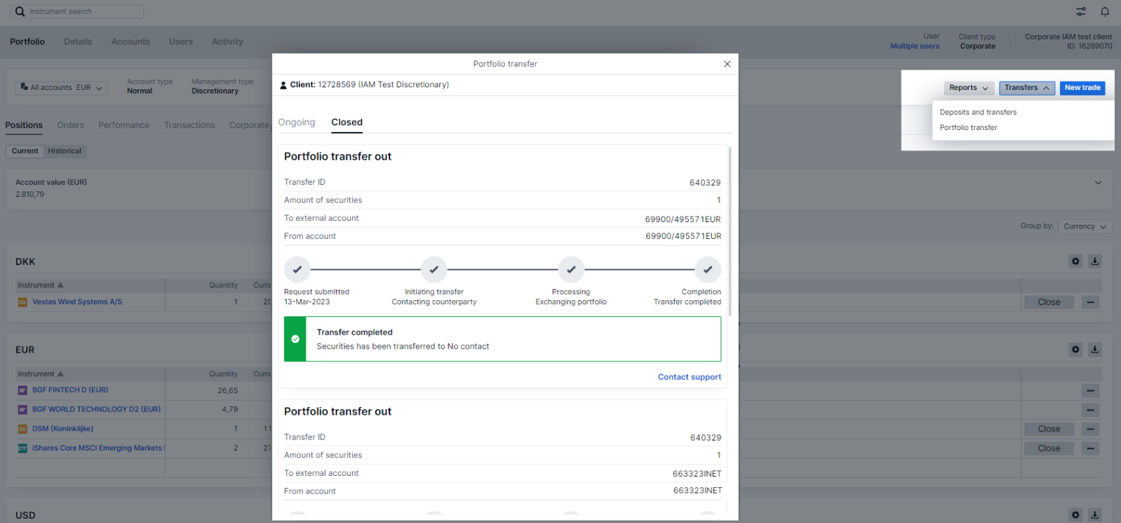 This read-only version of the Portfolio transfer module has been enabled to provide insight into the status of security transfers. To access the module, please look up a client with an ongoing or recently completed securities transfer, then under the “Transfers” drop-down menu, select “Portfolio transfer”.