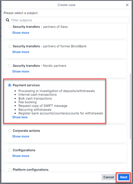 If you have any further enquiries, please contact the Payment Services via SaxoConnect (as shown in the image below) or get in touch with your account manager.