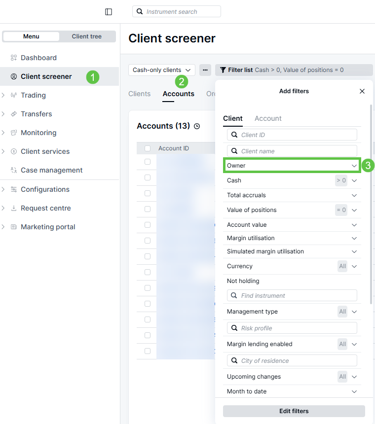 4. You can filter for a certain model using the Model name search field and change the filtering option from All client accounts to Linked to model to find which accounts are currently linked to the model you selected. You can of course filter for other results as well, including any accounts not linked to the model you have selected.(Please note, if you don’t see these filtering options, click the Edit filters button to add them.)
