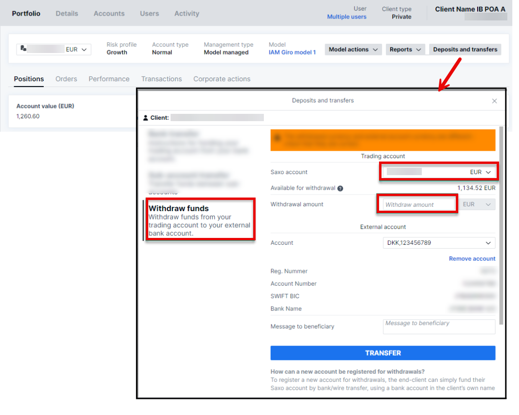 Cash withdrawal from a model managed account can be triggered from ‘Deposits and transfers’ button on single client view.