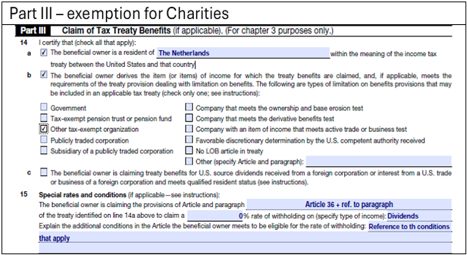 If your charity is listed, the W-8BEN-E form must be filled out by referencing the relevant treaty article.