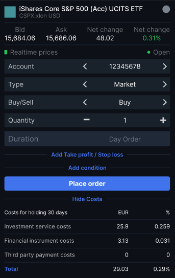Here you will find an overview of the fees that can be occurred when trading a specific financial instrument. Please keep in mind that for the Investment service cost we always anticipate the fees you will pay when selling your position.